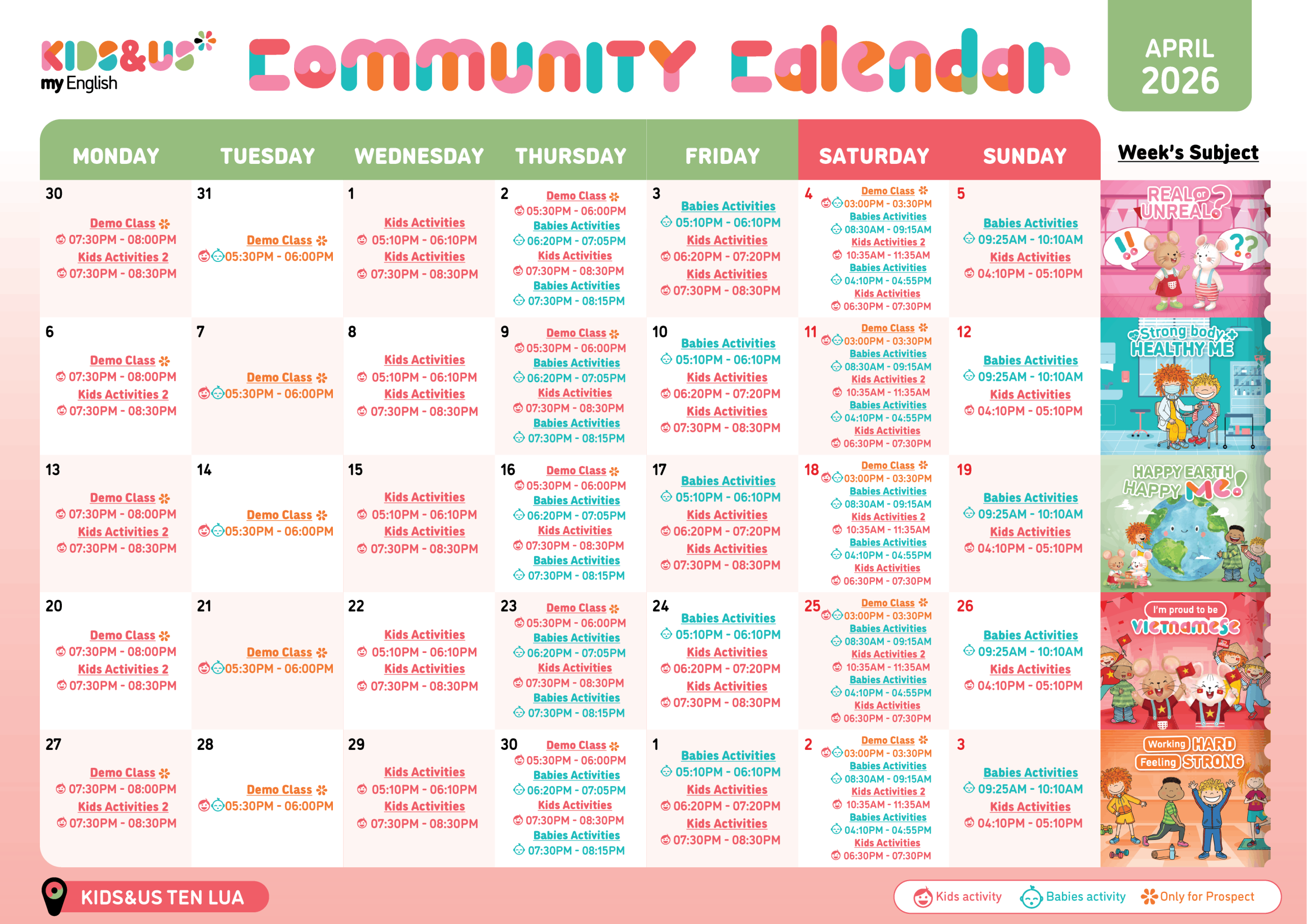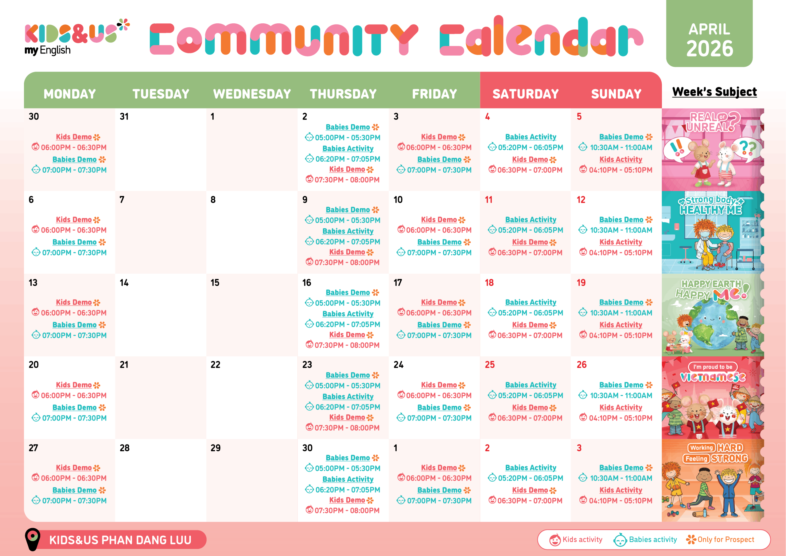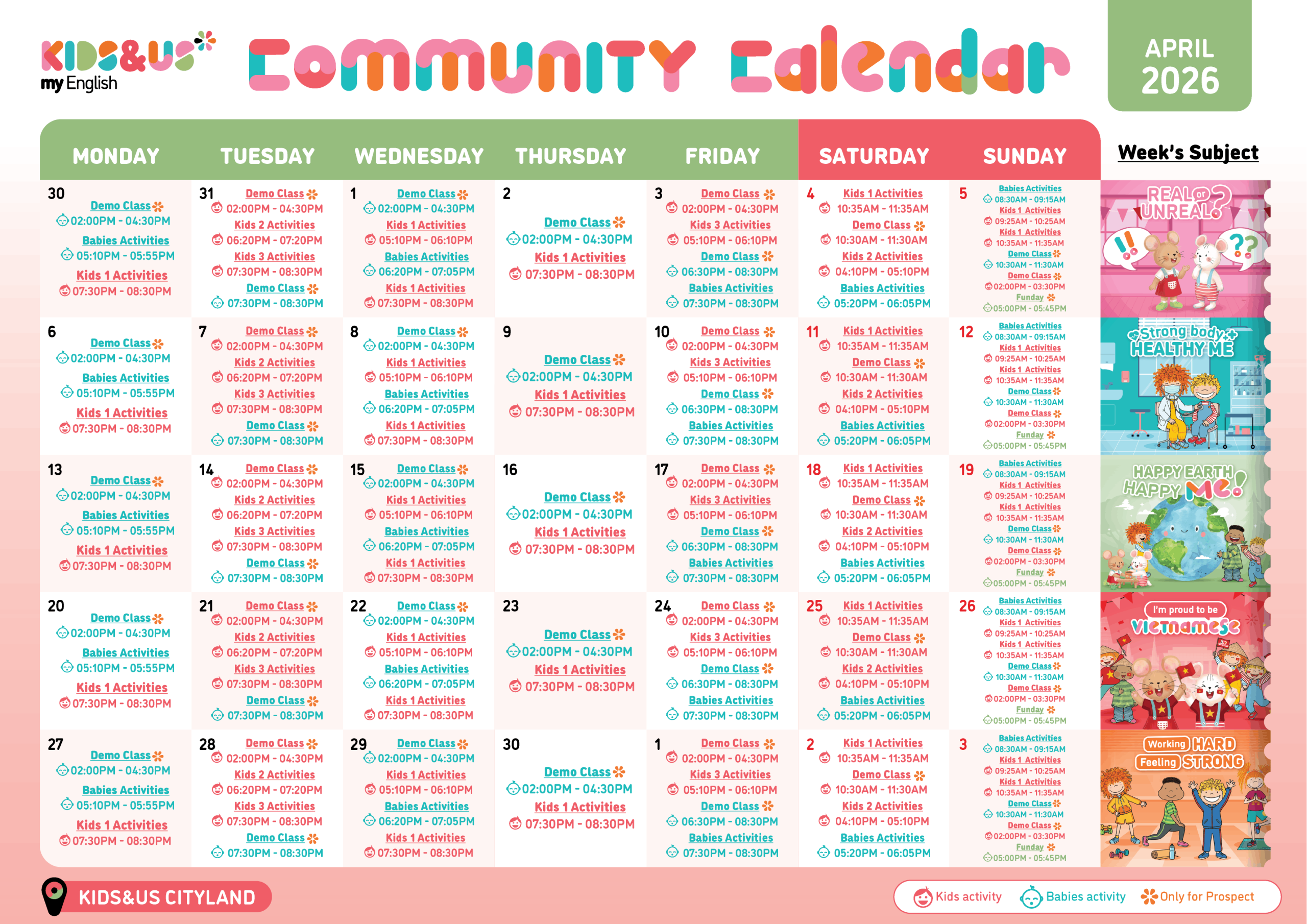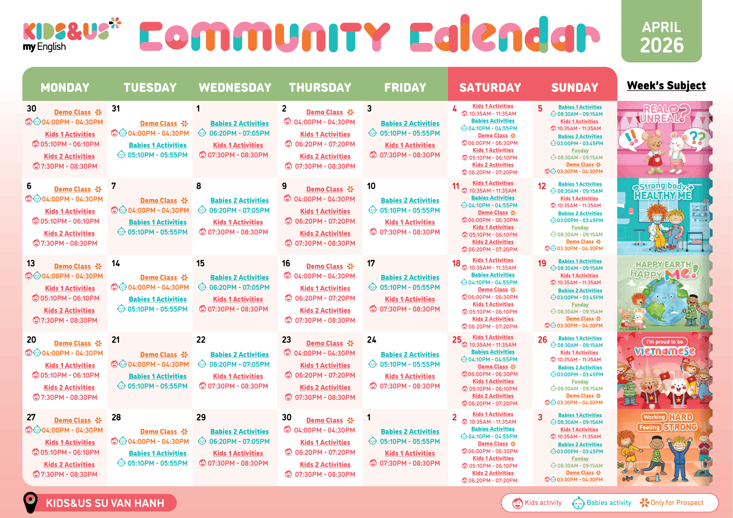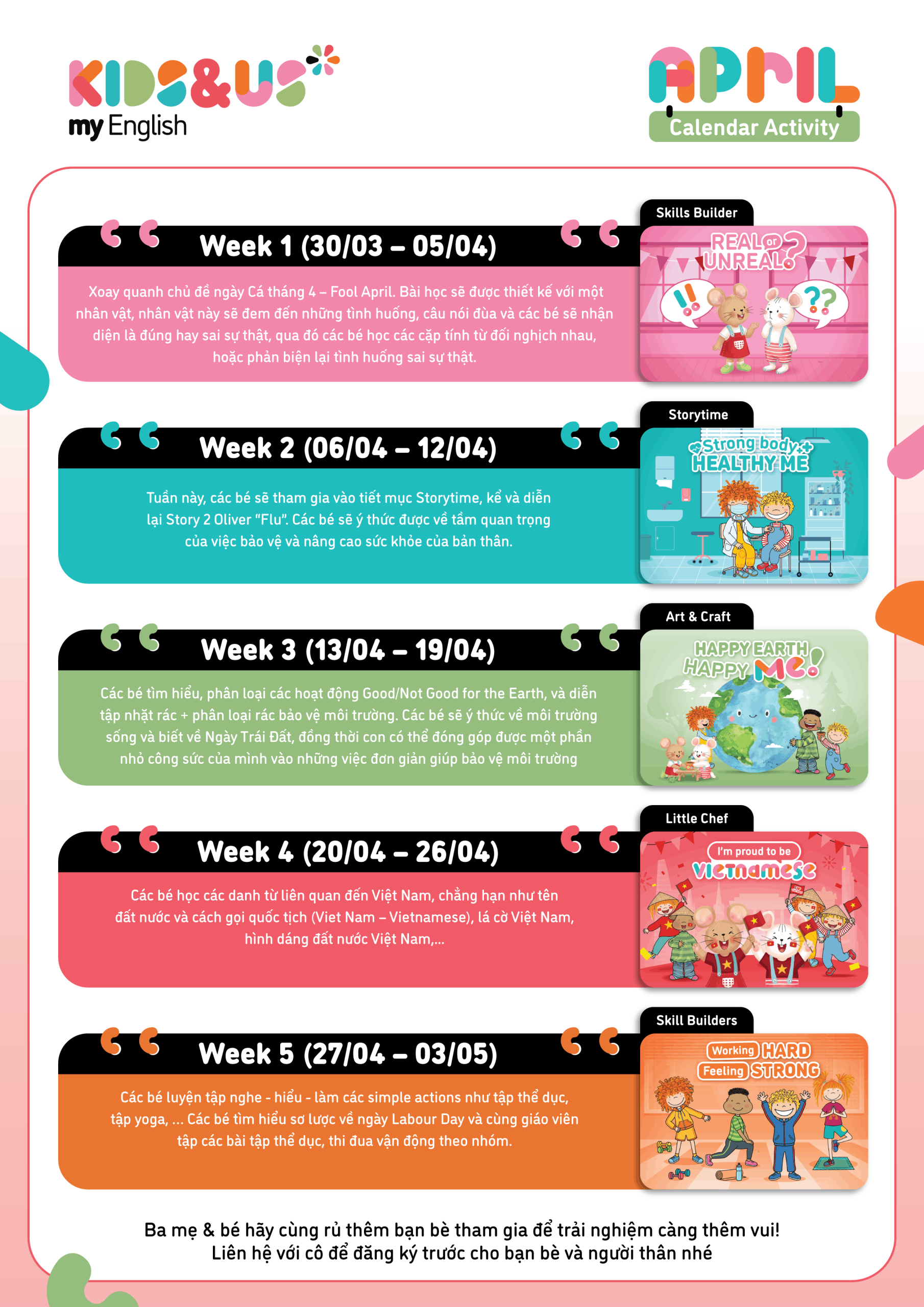 Tại Kids&Us, tiếng Anh không chỉ được dùng trong lớp học, chúng tôi đã xây dựng nhiều hoạt động bằng tiếng Anh để củng cố trải nghiệm học tập cho học viên.