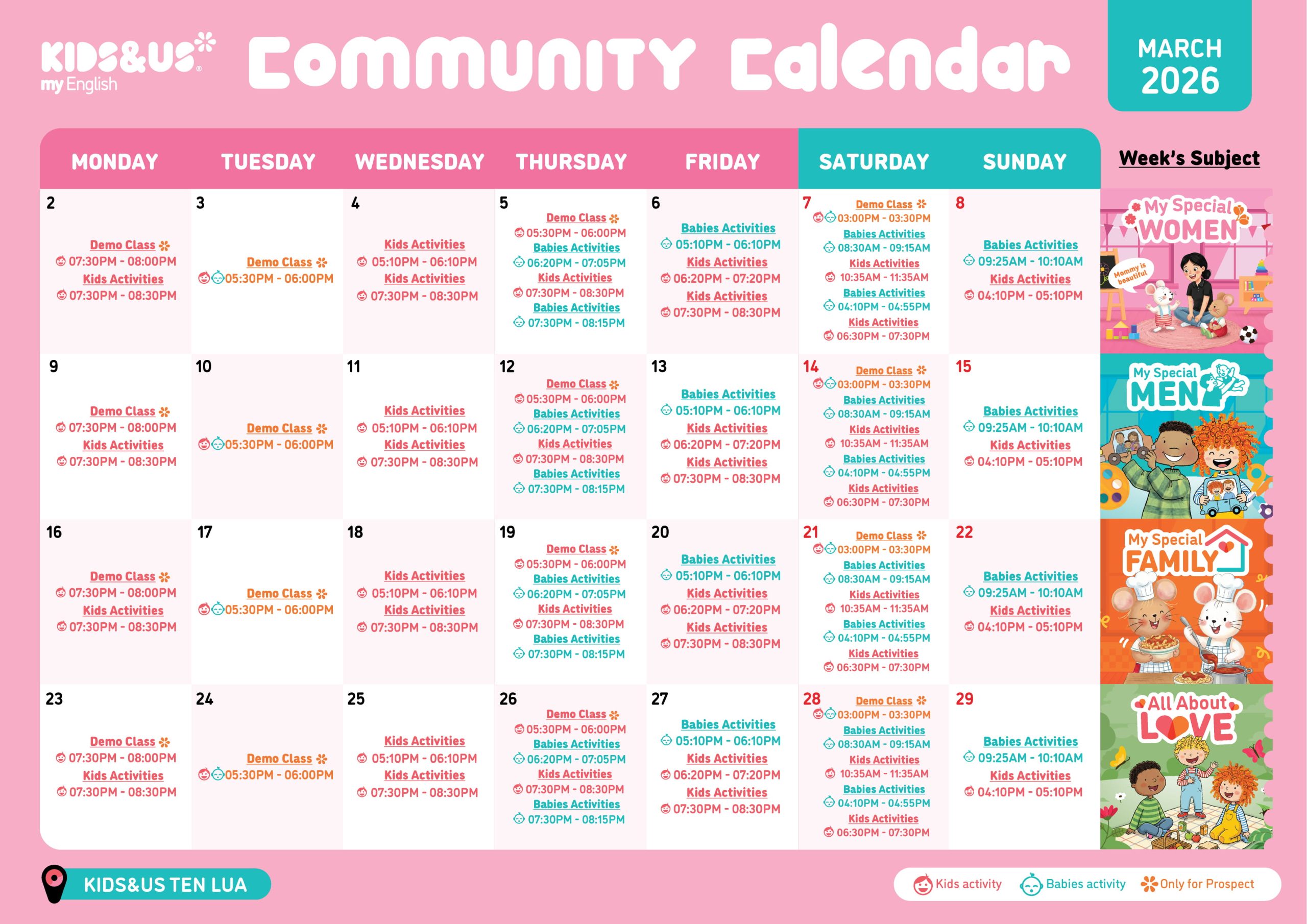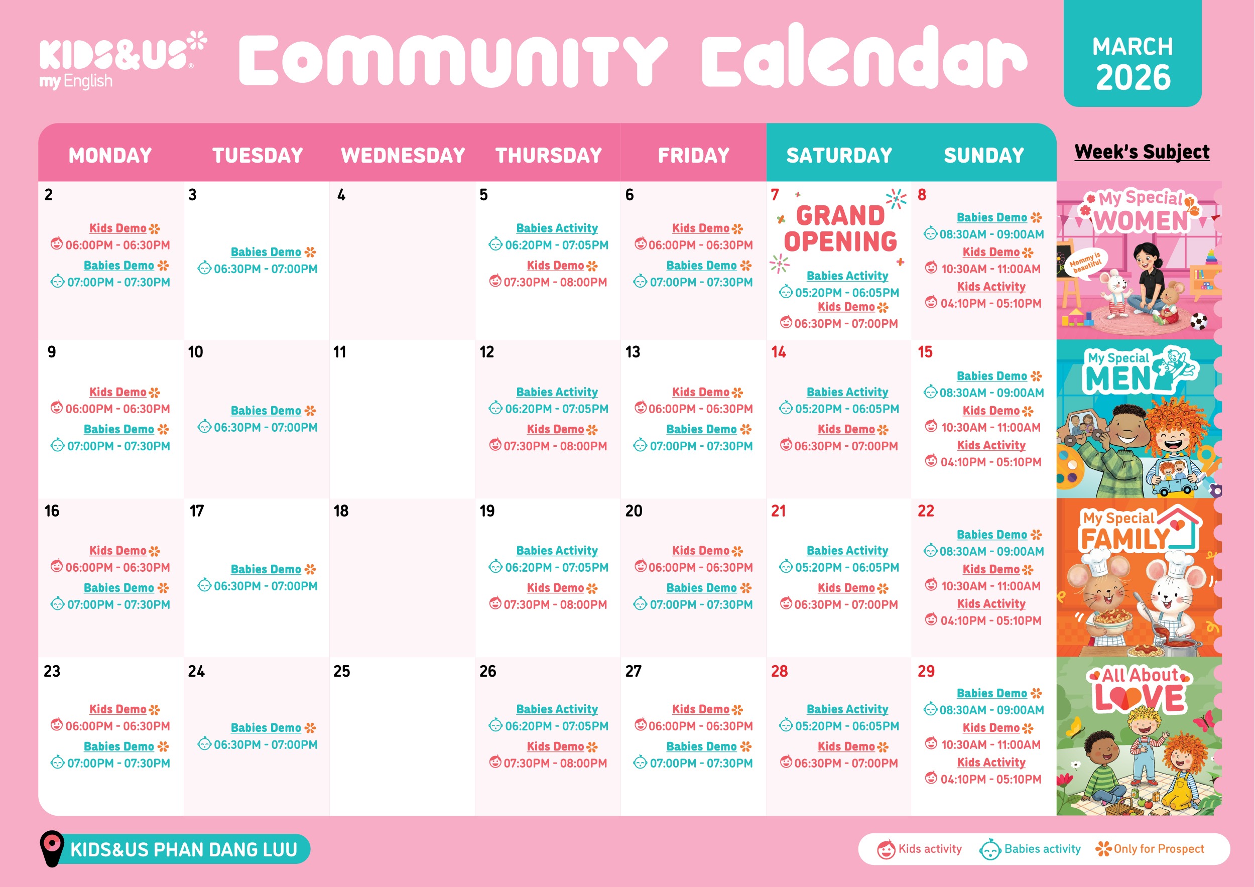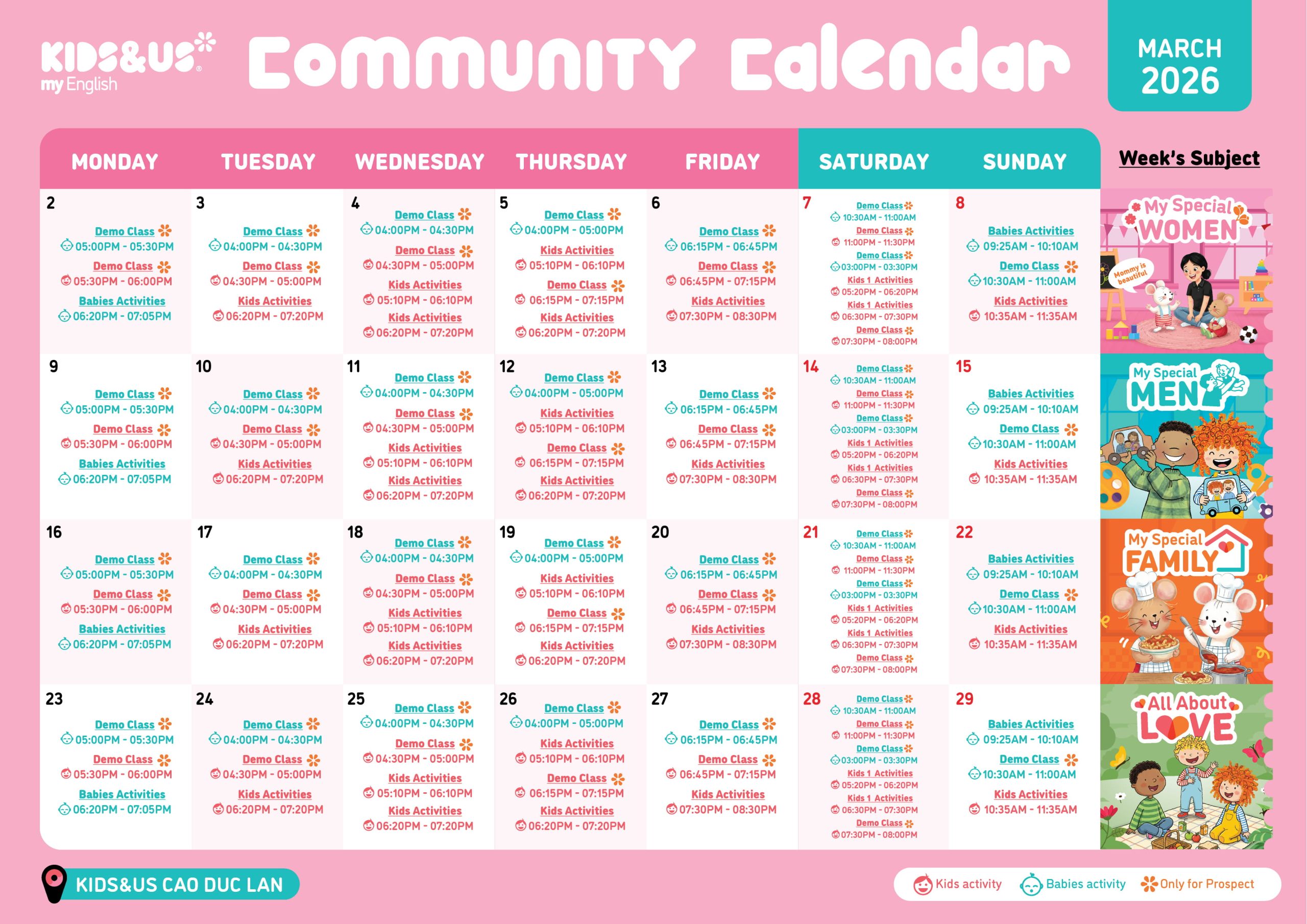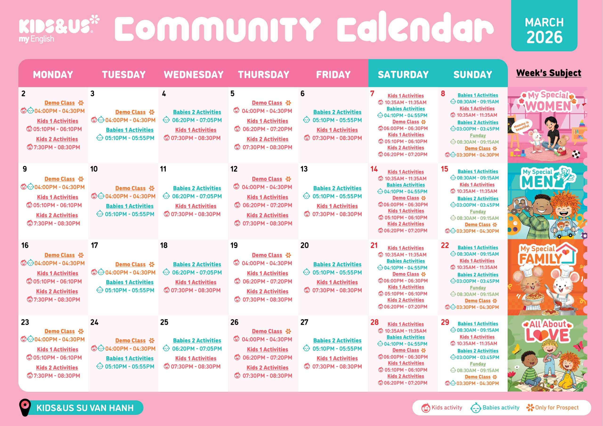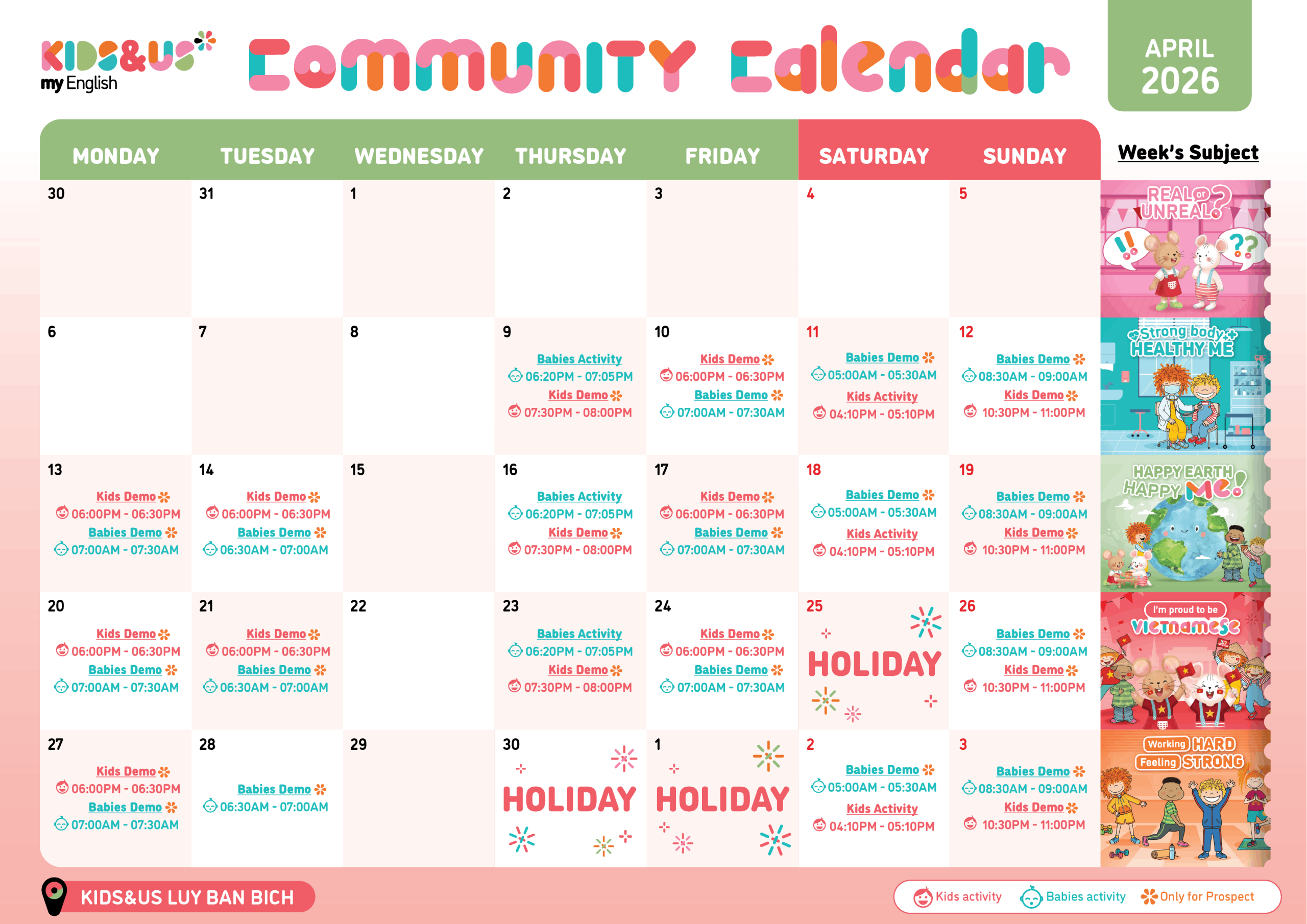 Tại Kids&Us, tiếng Anh không chỉ được dùng trong lớp học, chúng tôi đã xây dựng nhiều hoạt động bằng tiếng Anh để củng cố trải nghiệm học tập cho học viên.
