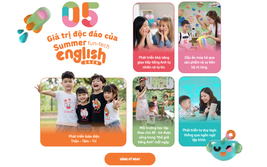 Sau mùa hè, ba mẹ sẽ nhận thấy không chỉ khả năng ngôn ngữ của con tiến bộ rõ rệt mà quan trọng hơn, con trở nên tự tin hơn, năng động hơn và sẵn sàng bước vào năm học mới với một tâm thế tích cực. Summer Fun-Tech English không chỉ là một khóa học – mà là trải nghiệm giúp con “bật chế độ phát triển” trong mùa hè này.