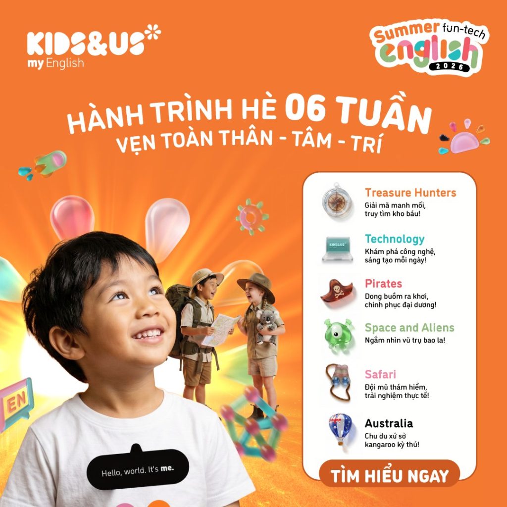 Hãy khám phá Summer Fun-Tech 2026 tại Kids&Us – khóa hè tiên phong kết hợp hoàn hảo giữa ngôn ngữ Anh và công nghệ, mang đến môi trường học tập trại hè bán trú tư duy thời đại, giúp trẻ phát triển toàn diện Thân – Tâm – Trí bằng tiếng Anh 100%. Đây không chỉ là một trại hè thiếu nhi thông thường, mà là một hành trình sáng tạo, trải nghiệm và tư duy mỗi ngày để con sẵn sàng trở thành thế hệ vàng của kỷ nguyên vươn mình.