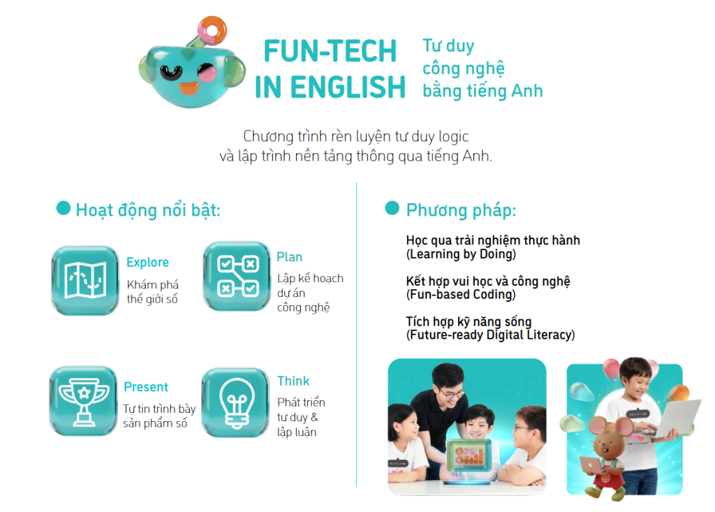 • 🧠 TRÍ: Tư duy được khơi mở khi các con khám phá công nghệ, giải quyết vấn đề và học cách suy nghĩ logic bằng tiếng Anh.