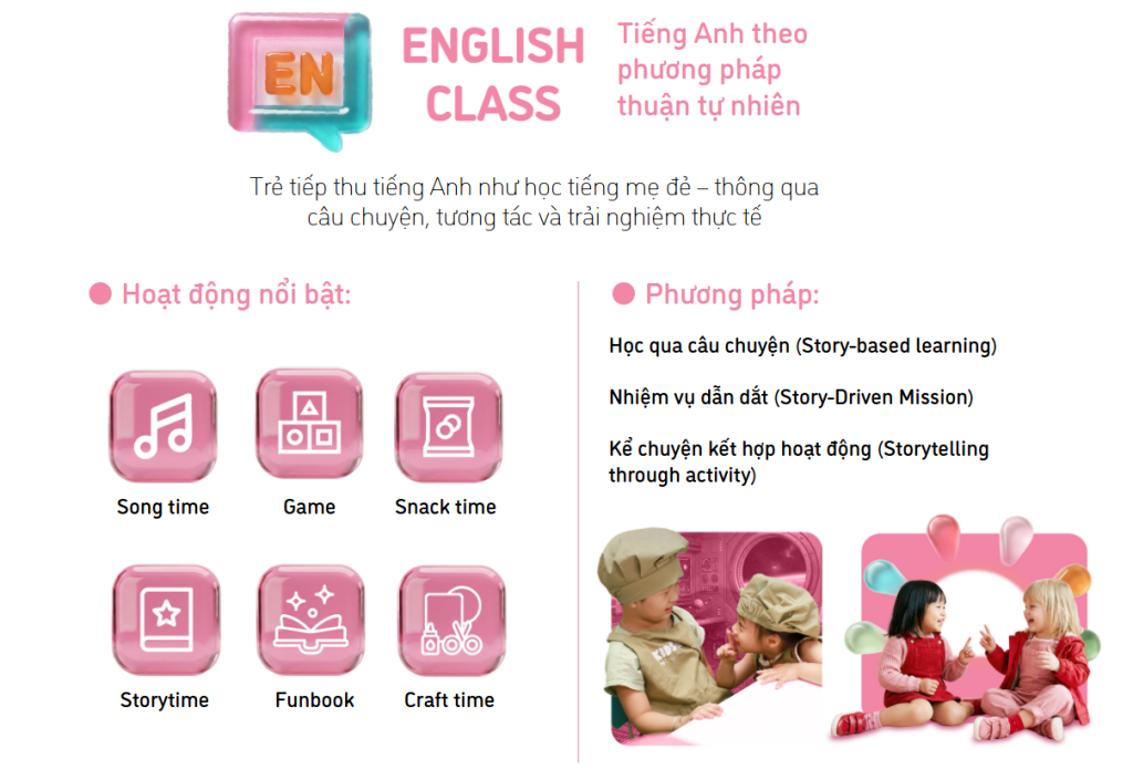 • Hoạt động nổi bật: Song time, Storytime, Funbook, Game, Craft time, Snack time… Con sẽ được sống trong một câu chuyện xuyên suốt, học cách tương tác và sử dụng ngôn ngữ trong các bối cảnh thực tế.